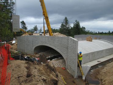 The soils enabled the box/arches and its wingwalls to be constructed on conventional spread footings with minimal stream incursion. From start to finish, installation of the precast elements took less than a week, with backfilling and roadway construction commencing soon afterward.